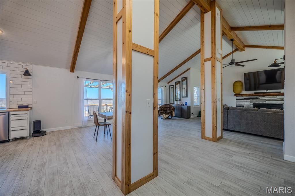 Looking for a breathtaking view? This home is situated atop a bluff overlooking the Osage River & Osage National Golf Course. Just a short drive to all the amenities the Lake Ozark offers? As you enter this 3BR, 2 1/2 bath home you will notice the spacious open floor plan, vaulted ceilings, ship-lap walls, wooden beams, tile fireplace and a lot of natural lighting. The spacious kitchen is a cooks dream with plenty of cabinet space, stainless appliances, center island and great view front he kitchen sink. Off the dining area is a large deck great for watching the evening sunsets. The master suite has a large walk-0in closet, plus a bathroom with walk-in shower and its own cozy deck. What a great place to just get away or to own your permanent Oasis.