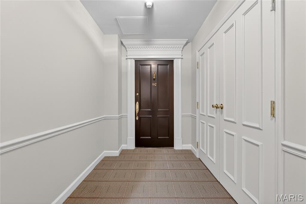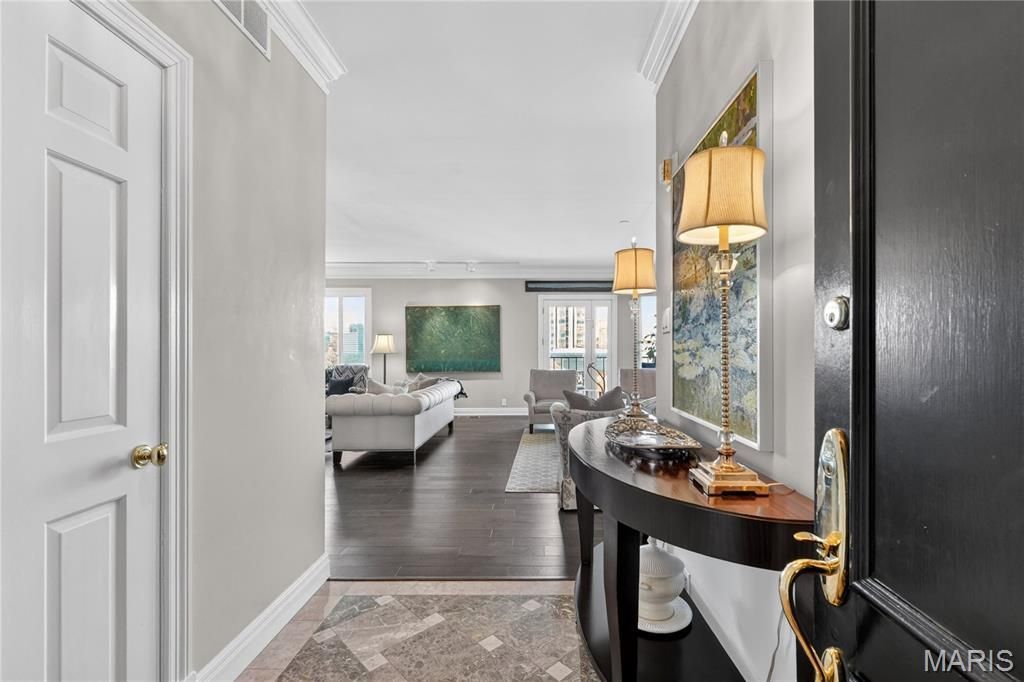 Stylish & Spacious Condo in a Prime Clayton Location! An imported marble entry sets the tone for this elegant, light-filled residence, where a refined great room with 9' ceilings, crown moldings, rich hardwood floors, and a sophisticated wet bar frames sweeping views of downtown Clayton. Step onto your private terrace to enjoy morning coffee or evening sunsets with stunning views extending to the Arch. Designed for both everyday living and effortless entertaining, the expansive formal dining room flows seamlessly into a custom kitchen featuring European-style cabinetry, granite countertops, ceramic tile flooring, and custom lighting. The spacious primary suite is a true retreat, offering abundant custom built-in closets and dual private baths-one with a tub-creating a spa-like experience. A generously sized second bedroom with an updated bath provides ideal space for guests, family, or a home office. Thoughtful updates and features include newer windows, cedar closet, in-unit laundry with additional storage, newer carpet/hardwood flooring throughout the main living areas. This exceptionally maintained, full-service building offers outstanding amenities, including a 24-hour door attendant and parking attendant, secure garage parking (2 spaces included), pool and patio, private storage locker, dog park, catering kitchen, guest suite, and a dedicated property and resident manager. Ideally located just steps from Clayton's premier restaurants, shops, and business district, with convenient access to downtown, major hospitals, and surrounding suburbs. Move-in ready and offering the perfect blend of comfort, convenience, and sophisticated living.